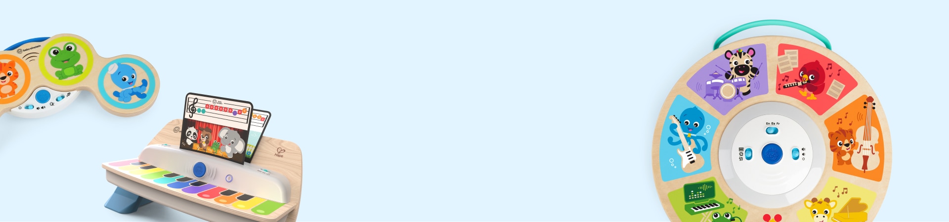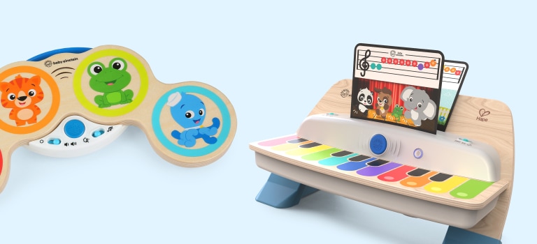 with the Notes & Keys™ Magic Touch™ Keyboard from Baby Einstein. Made with award-winning Magic Touch technology, this wooden toy puts music at baby’s fingertips… with no buttons or keys required! The portable design of this keyboard toy makes it easy to bring self-expression wherever you go, and it stows neatly away when not in use. The musical possibilities are endless in Freeplay mode, and baby can switch between piano, xylophone, hip hop and drum sounds. Our Play Assist technology helps baby discover a new song by following the lights, and Silly Mode activates sound effects galore. This developmental toddler toy introduces color and music notes while exploring cause and effect through sound. Your budding musician will be amazed at the way their fingers or toes can make music happen with just a tap!