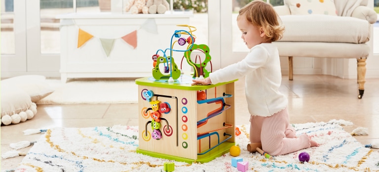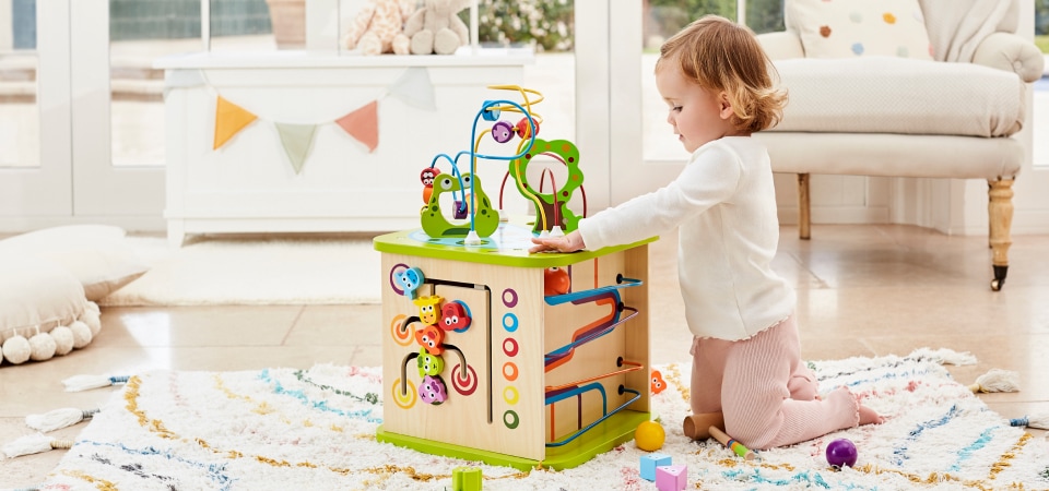 Abwechslung ohne Ende – das bietet der große Motorik-Würfel mit fünf Seiten: vielfältiges Motoriktraining mit süßen Kugeln an bunten Schleifen, ein buntes Sortierspiel und jede Menge anderer Spaß wie Hämmern und Drehen und sogar eine kleine Kugelbahn. Der Motorikwürfel ist ein echtes „Allround-Talent".